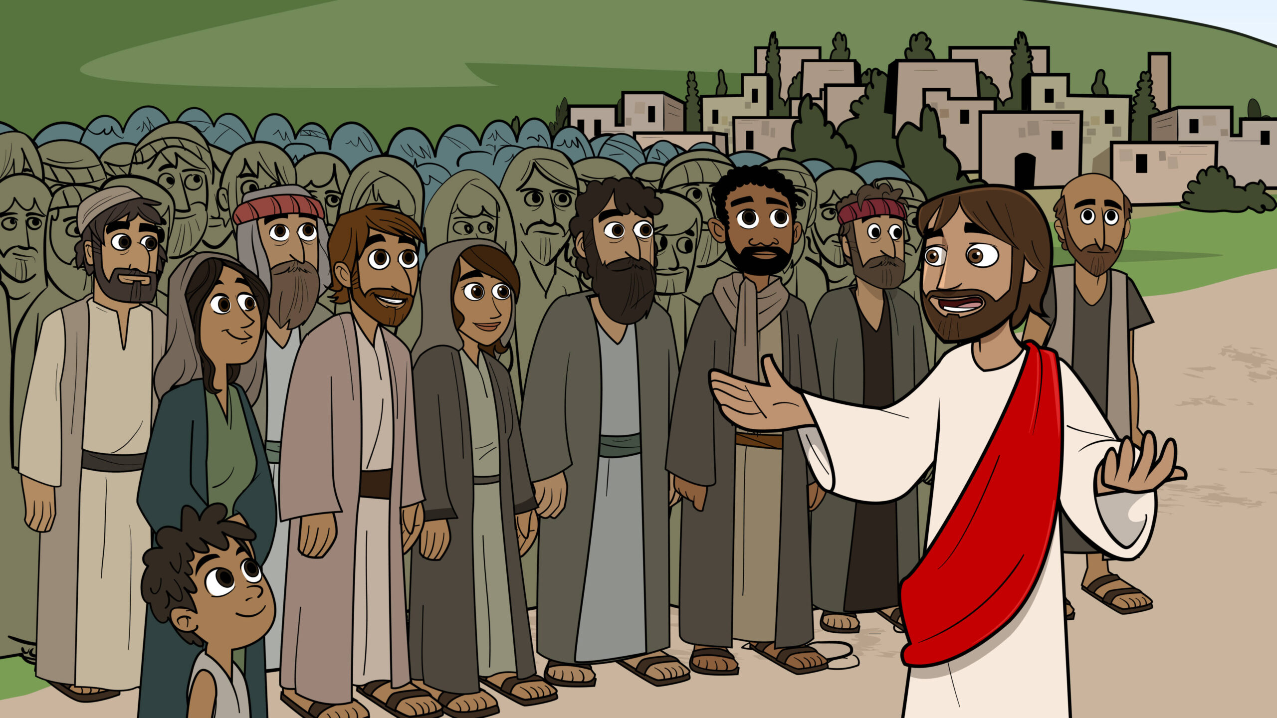 WHEN JESUS SEES A LARGE CROWD OF PEOPLE, HE TEACHES THEM IMPORTANT THINGS, BECAUSE HE LOVES THEM.
