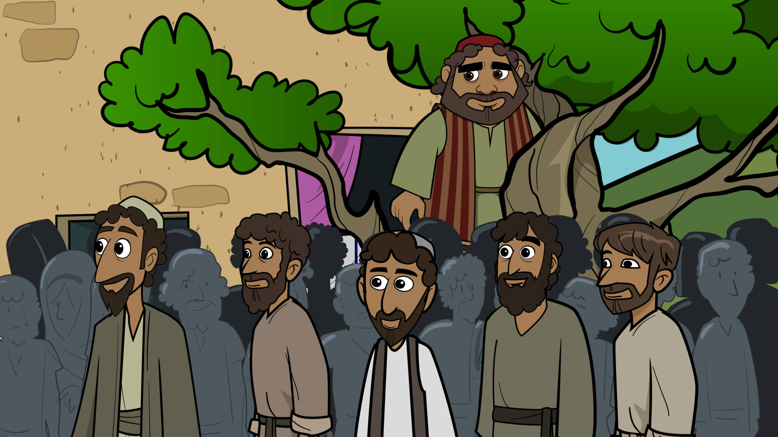 ZACCHAEUS CLIMBS A TREE TO SEE JESUS. JESUS TELLS HIM TO COME DOWN, AND THEN GOES TO ZACCHAEUS’ HOUSE.